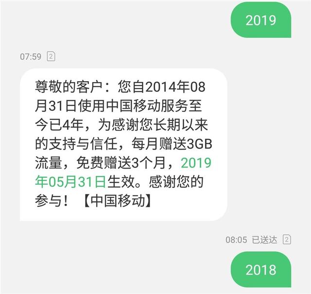 IT之家5月1日消息 昨天,根据网友投稿,向中国移动10086发送“2019”可以参加查“网龄”送流量活动,但是部分地区的小伙伴需要等到今天才能参加该活动。