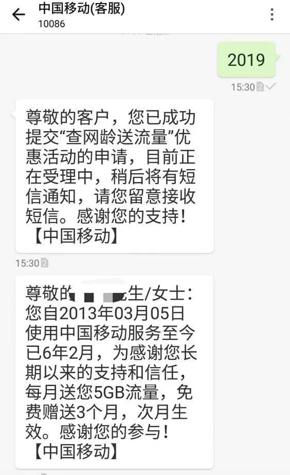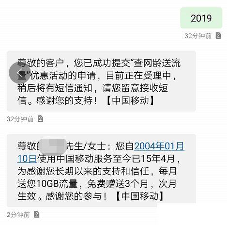 有网友尝试对联通 10010 发送 “2019”,但没有任何效果,此次羊毛为移动用户专属。不知道各位读者的移动号都用了几年?又领取到了多少流量呢?