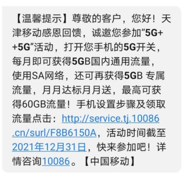 于是我打10086详细问了下。想看看是不是自己不符合这个要求,对方表示参与该活动只有两个要求,一是月套餐费要超过36元,同时60G免费流量分12月发放完,也就是每月5G免费流量,且每月无需手动领取,会自动发放。二是办理该套餐后中途不可以取消,如中途取消套餐中余下的流量将不再免费,需正常收费。这意味着只要在办理套餐后,一年内不换号,这60G流量是可以免费到手的,可以点击我收到的短信进行办理,然后我看了看移动给我发的短信。