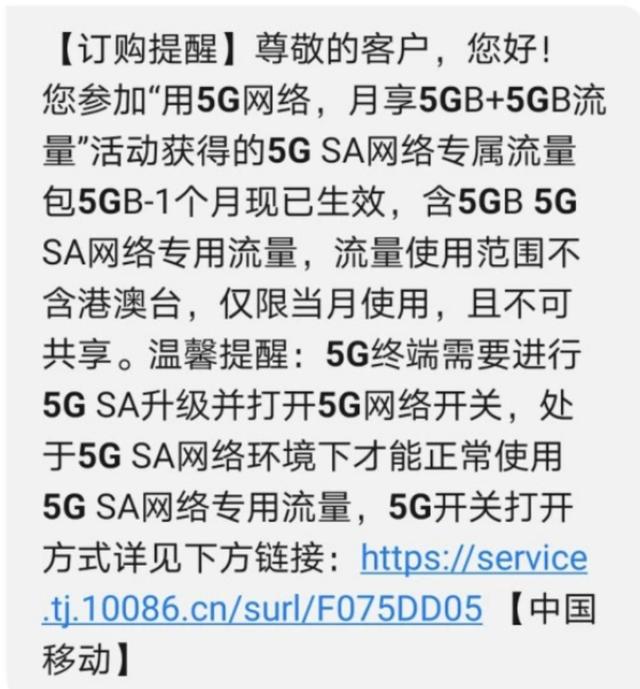 于是,我按照活动页面介绍,找到我的手机品牌,根据提示,打开了手机的5G开关和SA开关,体验了5G网络,结果转天我就收到了移动发给我的流量礼包!