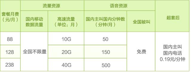 如今,中国移动终于爆发了,推出了一款88元全国不限流量,顾名思义88元月租,包含10GB全国不限速流量,超过后降为不高于1Mbps网速,并且每月赠送50分钟语音通话。当然还有128月租,包含20GB全国不限速流量,150分钟语音通话;238元月租,包含40GB不限速流量,500分钟语音通话。