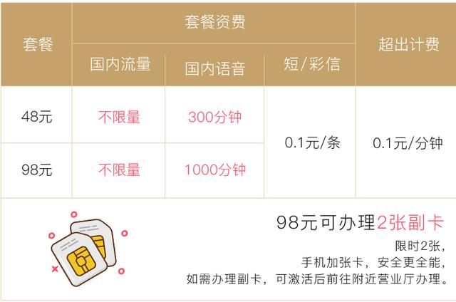 联通推出48元全国不限流量,包含10GB不限速流量,赠送300分钟语音通话,超过10GB后降为不高于1Mbps网速。不仅如此,联通还推出了99元全国不限速套餐,包含40GB不限速流量,当月超过40GB降为不高于3Mbps网速,超过100GB,降为不高于1Mbps网速,还可以办理2张副卡。