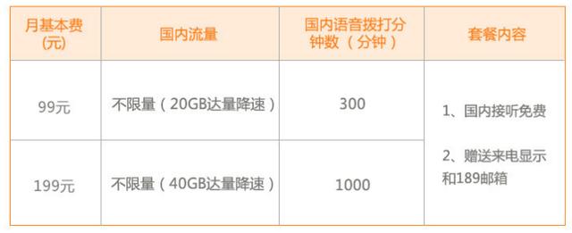 电信推出的99元全国不限流量套餐,包含20GB不限速流量,赠送300分钟语音通话,可以办理2张副卡。199元月租,包含40GB不限速流量,赠送1000分钟语音通话,依然比移动实惠不少,大家觉得呢?