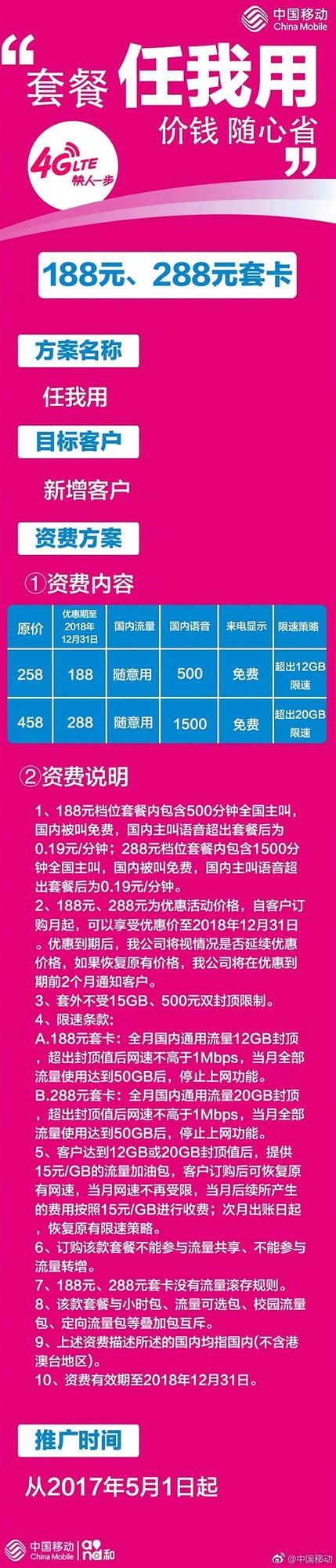 中关村在线消息:日前,移动宣布自5月1日起,启动新一轮的提速降费措施。将针对新客户推出188元和288元两档“任我用”流量包月套餐,分别包含12GB和20GB流量。针对老客户提供238元15GB流量的“任我用”流量包月套餐。今天,中国移动正式公布这三个套餐的详情,从此详情来看,并非完全是“任我用”。