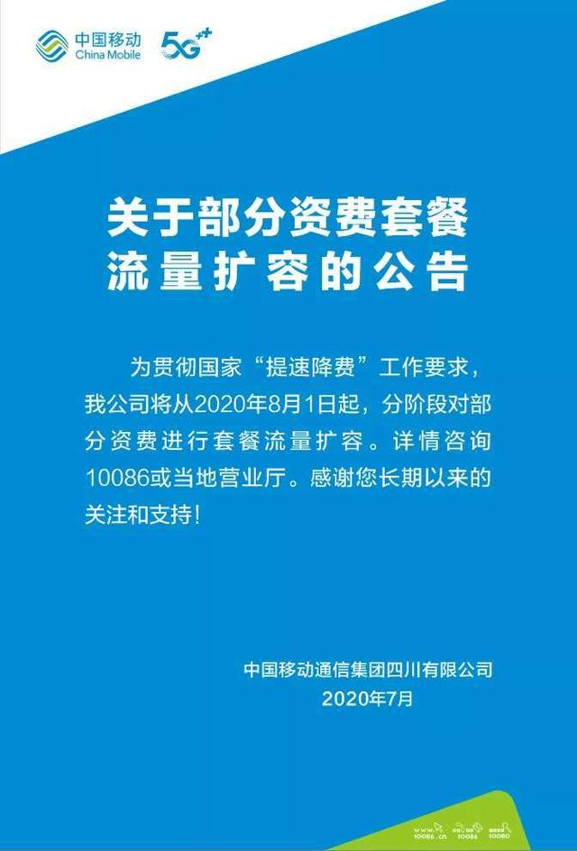 近日,据封面新闻了解,四川移动发布“关于部分资费套餐流量扩容的公告”,公告称四川移动将从2020年8月1日起,分阶段对部分资费进行套餐流量扩容。封面新闻致电四川移动采访,据四川移动相关负责人透露,此举是在客户流量需求逐步增长的背景下,推出的流量惠民举措,既满足国家提出的“提速降费”要求,又能让客户获得真正的实惠。