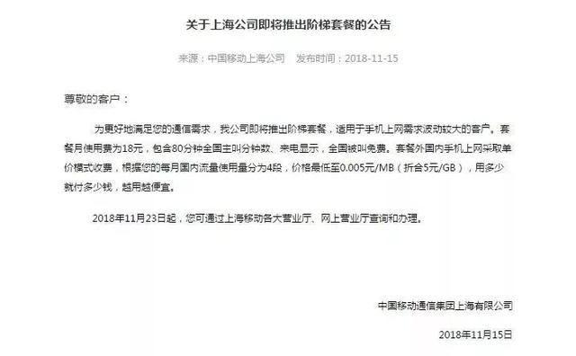 此外,中国移动上海分公司已经发布了新的阶梯套餐公告。