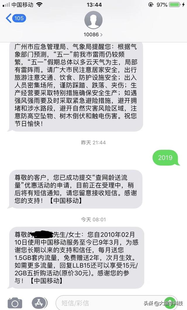 第一项福利:从5月1日起,中国移动正式推出了“查网龄送流量”活动,这项活动截止到2019年12月31日结束,移动用户只需编辑短信2019发送至10086即可免费获得流量,最高可获得长达2年,每月免费获赠30GB流量,这项免费五福与用户的网龄时长有关,网龄越长、优惠时间越长、赠送流量也越多。