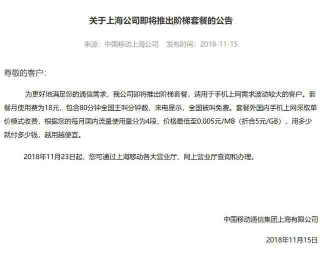 这种套餐月使用费为18元,包含80分钟全国主叫分钟数、来电显示,全国被叫免费。套餐外国内手机上网采取单价模式收费,根据用户每月国内流量使用量分为4段,价格最低至0.005元/MB(折合5元/GB)。公告显示,11月23日起,用户可通过上海移动各大营业厅、网上营业厅查询和办理。