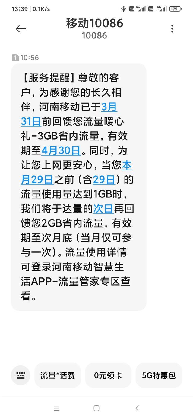 为感谢您的长久相伴,移动公司于月底前回馈您流量暖心礼-3GB省内流量……当您本月流量使用量达到1GB时,我们将于达量的次日再回馈您2GB省内流量,有效期至次月底(当月仅可参与一次)。
