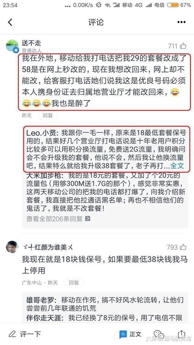 其实很多人都是因为捆绑了银行卡电话,淘宝电话,微信电话才不得不将就着用移动,也是不想费事罢了。可移动不但不琢磨着把流量资费降低点,还经常整出点奇葩套餐,把消费者不当回事,周围不少人开始养卡了,就是不停机,个把月也不打一个电话。(一个月才八块钱)