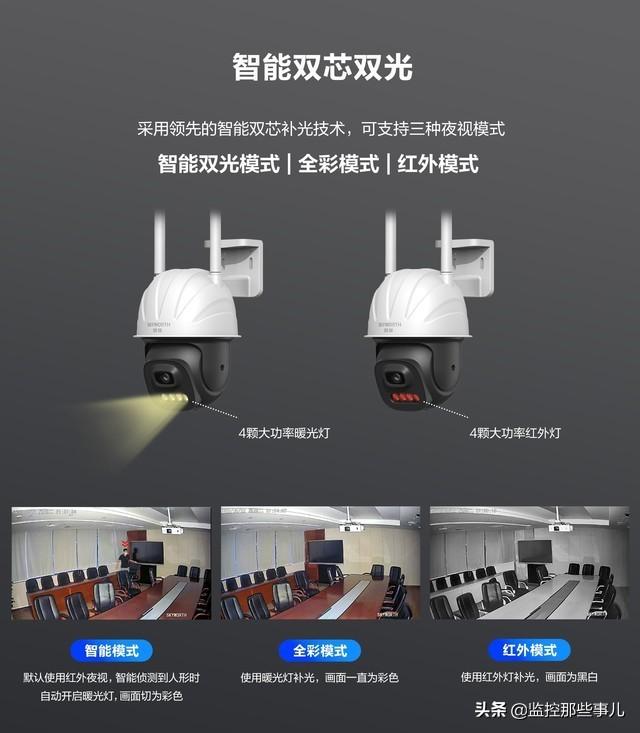 除了拥有出众的图像呈现能力外,其还外置了4颗大功率暖光灯和4颗大功率红外灯,支持红外模式、全彩模式、智能双光模式三种模式,其中红外模式使用红外灯补光,画面为黑白色;全彩模式使用暖光灯补光,画面一直为彩色。