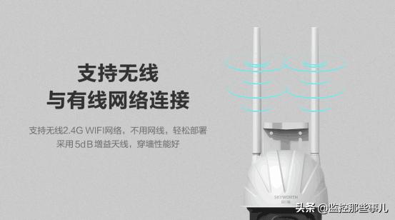 创维400万智能警戒球机配置了5dB的高增益天线,穿墙性能好,数据传输稳定,在一些无法布线的墙体或场景中,可通过无线连接的方式完成布控。同时,为了适应更多场景,此款产品还支持有线网络连接。