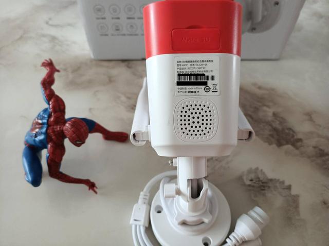 360智能摄像机红色警戒高配版底部除标有摄像机的信息外还有存储部分以及一颗高保真双向语音通话喇叭,不仅可以实时语音通话还可以通过摄像机APP的AI看家警戒等功能实现自动喊话声光报警震慑等功能。