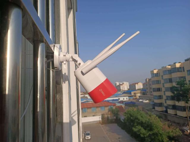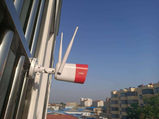 安装固定方式因为暂时没回老家我选择了。 将360智能摄像机红色警戒高配版固定在我家里阳台上对楼前、楼下进行拍摄测试。