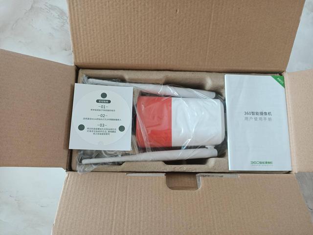 打开包装盒看到360红色警戒高配版,主要由摄像机、电源、定位贴纸、说明书这4类构成可以说非常的简洁。