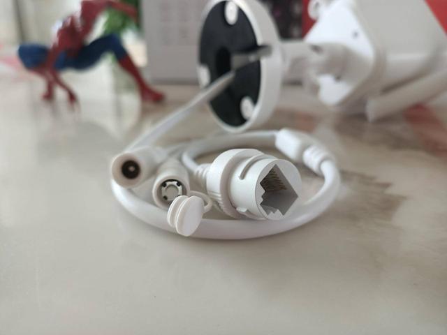 360智能摄像机红色警戒高配版的线材部分分为一个12V电源线孔,一个恢复出厂按键以及一个网线插孔,恢复出厂按键配有防水键帽。