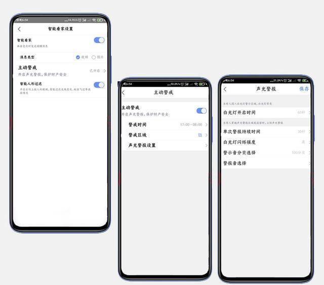 AI智能看家模式,通过摄像机各类硬件的智能结合对摄像机进行警戒时间、区域、声光报警时间等设置。警戒区域类似于可以根据自身需求手动调节划分报警区域当有人进入该区域时摄像机触发报警提示或发送信息到手机。