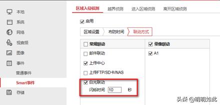 进入WEB端的联动方式,还可选择白光联动进行白光灯闪烁,设备白光灯闪烁间隔0-10秒可选。