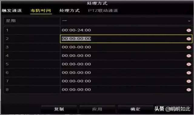 ⑦对配置参数完成设置后,需要进行布防时间的设置。点击"处理方式"后选择"布防时间"可进行侦测时间段设置,每天最多可设置8个时间段。