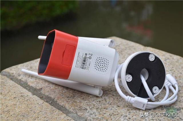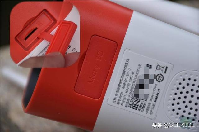 红色的机头部分设有SD卡槽,最高可支持128G容量,白色机身部分的圆孔则是这个摄像机的喇叭,能发出警报声