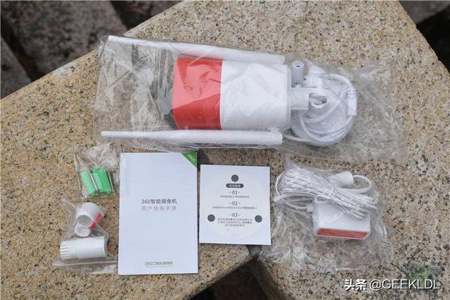 在360红警高配版的包装内包括智能摄像头一个、电源适配器一个、用户使用手册一份、安装定位贴纸一张、网线防水盖帽一套、膨胀螺丝一套