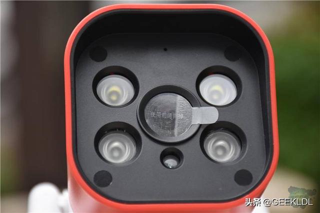 取出摄像头,我们可以看到,摄像头的正中间就是300万的高清摄像镜头,四个角上是四个灯,上面两个是白光灯,下面两个是红外灯,摄像镜头的正上方有一个小圆孔,是这个摄像机的MIC,摄像镜头的正上下方则是光敏元件,感应白天黑夜的,来让摄像机的四个灯自动补光