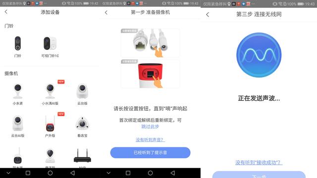 根据APP的说明,选择好产品之后,长按设置按钮,就可以听到“嘀”的一声。之后,手机会发出配对声波(请把扬声器音量开大),把手机凑近摄像机就可以配对。之后就是设置WiFi,当然,也可以直接插网线。