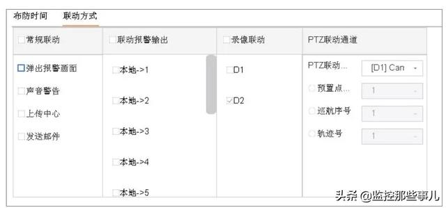 联动方式主要包括:弹出报警画面,NVR本地声音警告,上传中心,联动报警输出、PTZ联动等。即勾选了联动方式后,也需要在布防时间内,联动方式才会生效。
