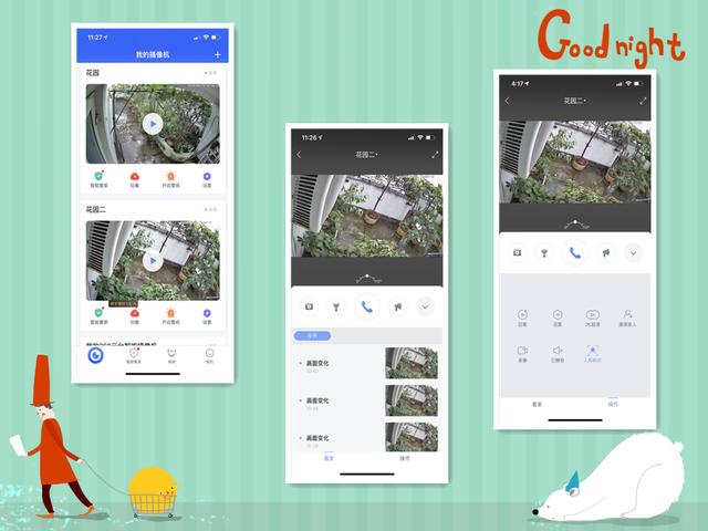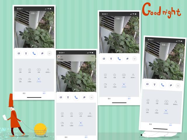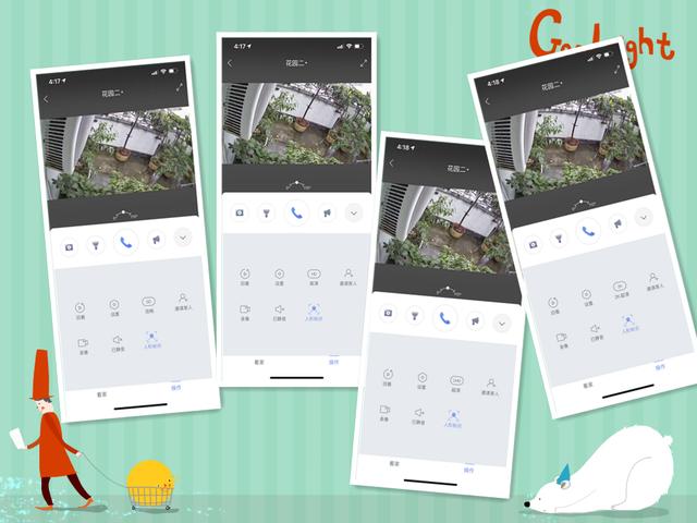 我们来看看APP都有哪些功能, 在360摄像机app里,首先可以看见的就是摄像机列表,点击摄像机进去,可以看到,分别有“看家”和“操作”2个页面。其中看家里,可看见有监控画面、下方是历史的异常记录。中间是几个按钮,分别是拍摄、照明、警示、对话的功能。而右侧的操作界面类似。只是下方的异常记录,变成了操作功能,包括有回看、设置、2K超清、邀请家人、录像、已静音、人像识别。