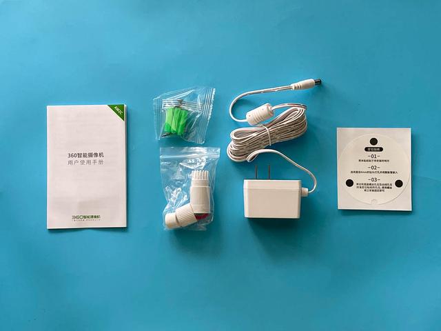 配件有用户手册、安装孔位贴纸、安装附件胀管和螺丝,户外网线防护配件,电源。