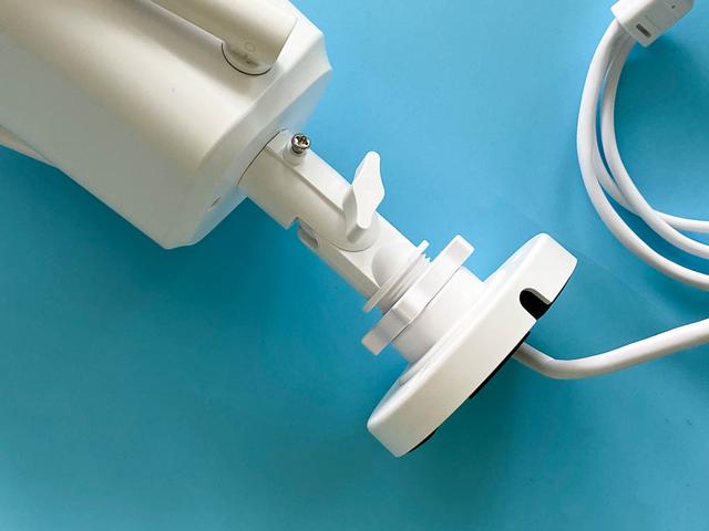 在尾部缠绕着外接的线缆,可以看到摄像机云台的转轴。