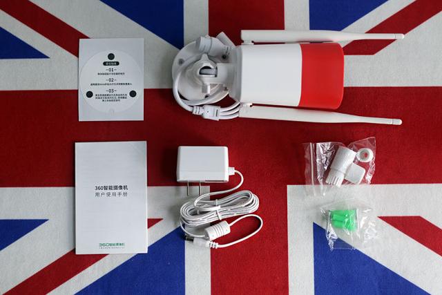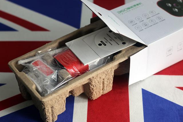 打开包装后装箱清单包括有360摄像机红色警戒标准版主机、电源适配器、产品说明书、上墙定位贴纸、密封塑管套件包、安装螺钉套装。