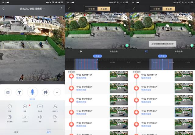 日常操作时直接点入APP主页的摄像机画面,界面非常清爽简单,上半部分为实时画面,下方会有拍照、光警、对话、声警的快捷操作按钮,下方则是看家消息和操作选项,包括会看、设置、清晰度、邀请家人、人形标识、静音、录像的选择,回看状态画面下能够排列出已侦测的异动画面,同时我们还能够以1倍速、2倍速、4倍速的选择去回看录像。