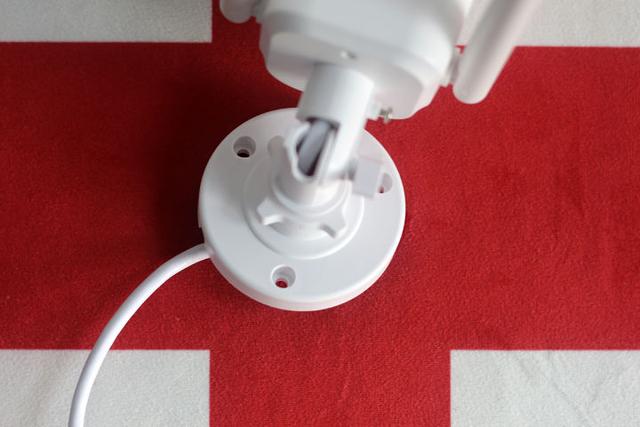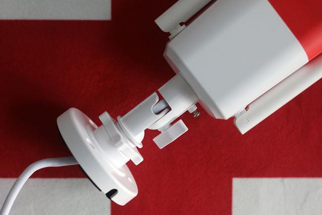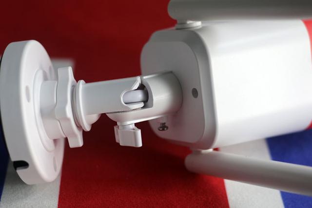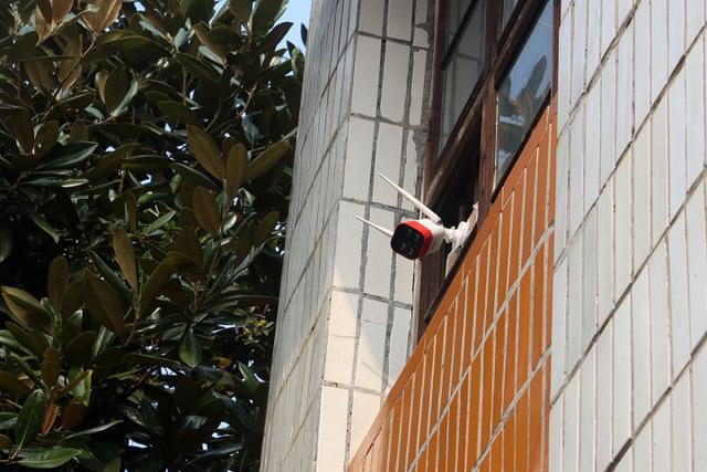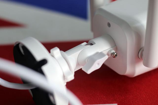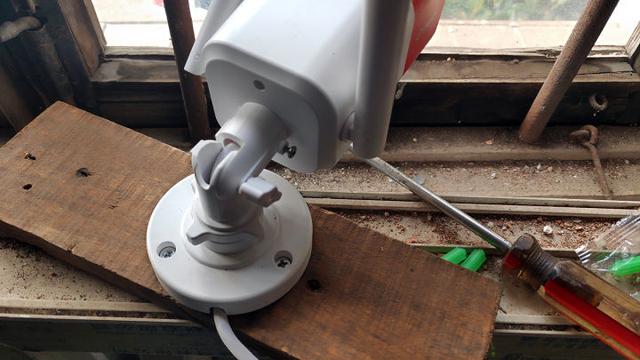 将附送的定位贴纸粘贴于墙面上,并按照图示位置钻孔。将膨胀螺栓按照定位贴纸孔位打入墙体,使用螺丝钉将机身底座固定。由于环境复杂加上没有电锤,笔者决定将摄像机安装在木板上,再将木板绑扎固定在二楼窗户上。预先可以进行机身角度的调节:拧松旋钮和螺丝,可以对摄像机机身进行角度调节。调节完成后,线拧紧旋钮再拧紧螺丝。