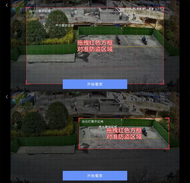 同时为了更好的实现声光报警的效果除了有云端人形识别,还有一个本地越界侦测,通过设置(可选择位置和大小)红色的两个红色方框区域(外实线为白光灯警示区域,内虚线为声光警报区域)来实现,笔者尝试监测并守护笔者放在楼下的小电摩。