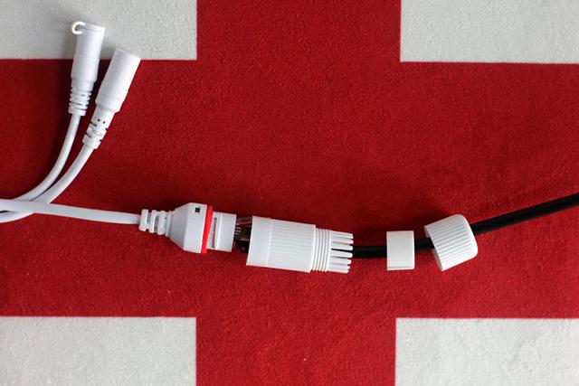 安装时我们可以预先模拟一番,接线方面虽然送有防水接头等配件,但并非作为电源接头处的密封防水的设计。