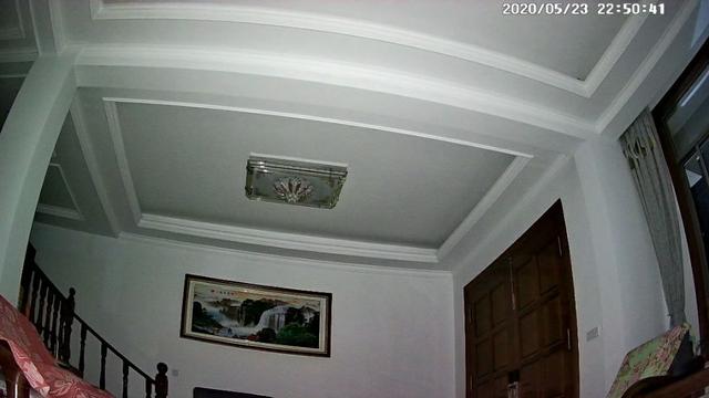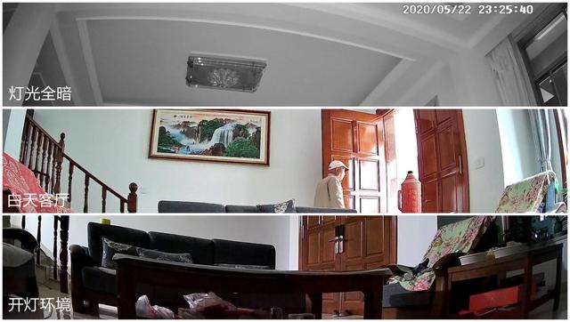 这个是在不同灯光状态下的对比,前面是在未开启全彩夜视功能情况下,晚上、白天和较远灯光的画面,清晰度不用说,肯定是白天状态下最清晰,对面墙壁的画细节清晰可见,如果是灯光较弱情况下,依然可以看到彩色画面,如果灯光全关,打开红外夜视,画面则是黑白色的。但如果开启全彩夜视模式(二图),摄像机在暗光线情况下,自动打开补光灯,色彩画面就比较清晰,而且也是彩色的了。
