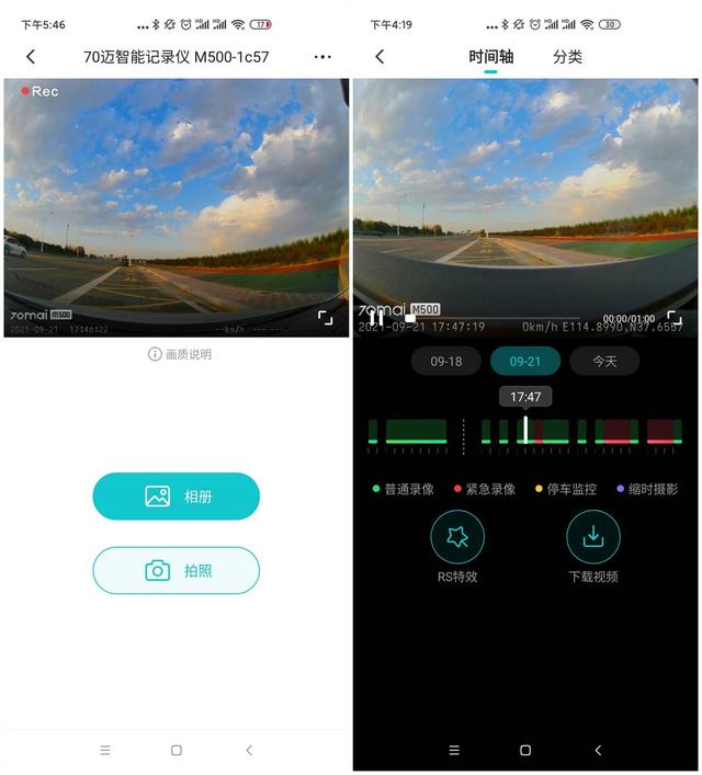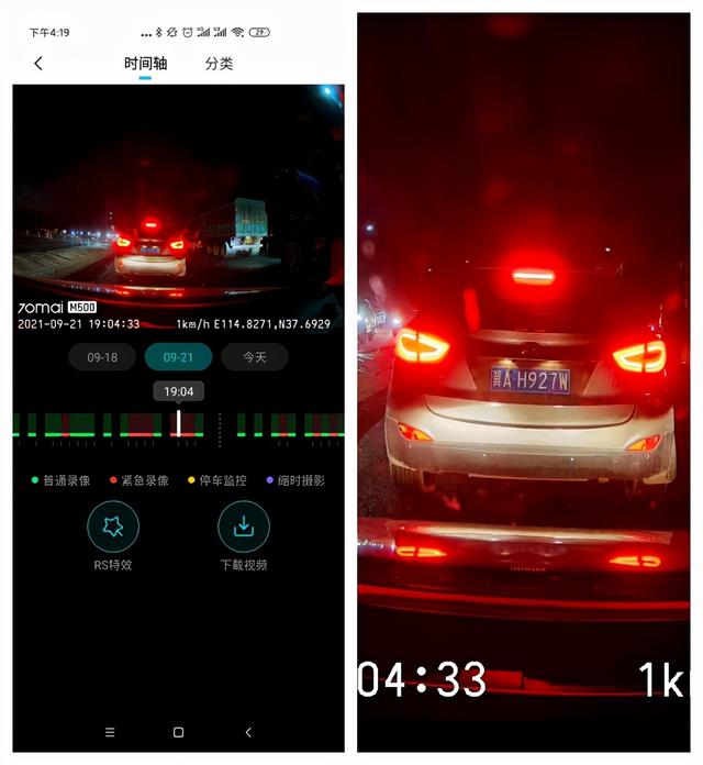 可以看到,白天的时候摄像记录犹如手机拍摄般的清晰,而且在APP中可以进行回放,想看哪里的视频就直接拉到哪里,对于不同的情况也会有颜色的标记,另外如果觉得视频长度过长,还可以使用RS特效。我们可以直接在APP上微型车影像自动合成视觉特效,于是在外出自驾游的时候也能够让自己的旅行变成精彩的纪录片,也增添了很多的乐趣,因此这款产品也的确表现的非常不错。这其中无论是基础的安全保障,还是一些非常强大的黑科技,都能让车主得到满意。
