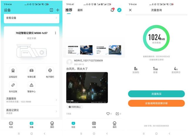 我们看到主界面还是非常简洁的,上面包含了一些需要4G模块和停车监控线的功能,比如远程监控车辆位置等,还可以实时查看流量以及连接记录仪实时查看的功能。