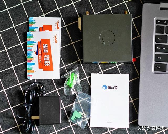 具体配件就包括了蒲公英R300A主机、4G/WiFi天线各一根、电源适配器一个,说明书一份、两张赠送的物联网流量卡、墙面固定螺丝等。