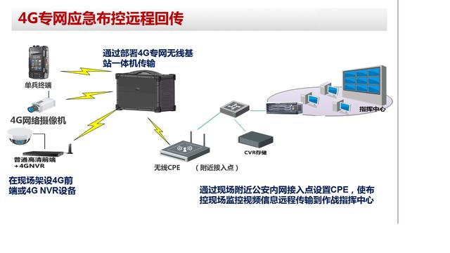 3)现场架设无线专网发射装备,在基站覆盖半径内的公安内网接入点设置CPE,架设无线专网接收设备,如果传输距离较远可以由卫星、微波等通信设备传回指挥中心,实现实时无线监控。