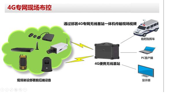 3)现场架设4G专网应急指挥一体机(自带基站功能),接入部署的无线前、后端设备,一体机可通过VGA线连接显示屏查看接入设备的视频图像。