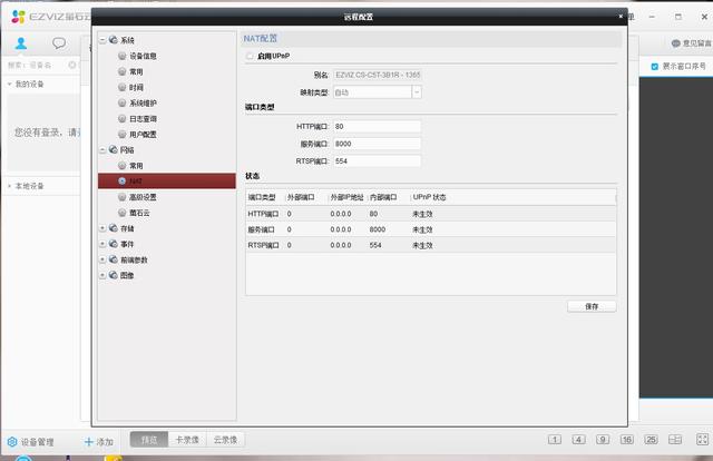 然后在监控客户端的设备管理设置页面——网络——NAT——"启用UPnP"去勾,然后修改摄像机的HTTP端口、服务端口及RTSP端口等参数(如果只有一台设备默认参数可以不用修改),然后应用保存。