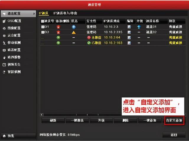 以海康威视录像机添加其他品牌的摄像机为例,如果在通道管理页面直接点击添加IPC,则可能出现“未知错误“、“未认证”等异常状态,摄像机无法正常显示图像。如果摄像机支持ONVIF协议,就可以添加。具体步骤如下: