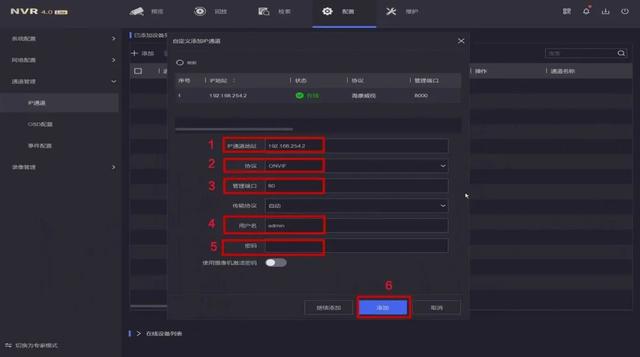 路径:进入配置 → 通道管理 → 通道配置 → IP通道,点击左上角“添加”