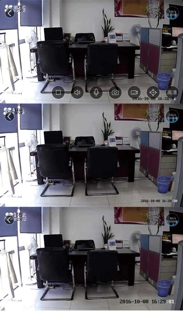 C6H最高提供1280*720分辨率的画质,画面非常高清,同时也支持高清、均衡和流畅三档,码率自适应。高清模式下,图像清晰度高,云台操作较为流畅;均衡模式和标清模式下,图像清晰依然很高,云台操作流畅,没有卡顿现象。下图为小编在不同清晰度下操作云台的截图: