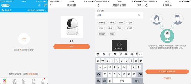 用户需要下载萤石云视频App并注册,然后将产品联网。C6H这款产品可以连接WiFi网络及有线网络。在连接WiFi网络的时候由于小编无线网速不稳定的原因,连接时间耗费较长,换成有线网络就迅速的连接成功。不仅如此,用户还能将设备分享给家人朋友,实现多人操作,更方便更安全。下图为设备链接过程。