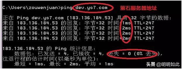 远程网络测试时可以ping萤石服务器地址:dev.ys7.com。