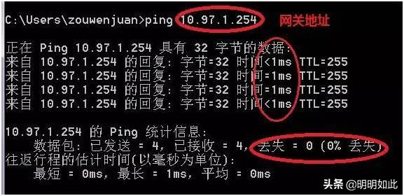 本地网络测试时可以使用计算机的ping命令直接去ping本地网络的网关地址。