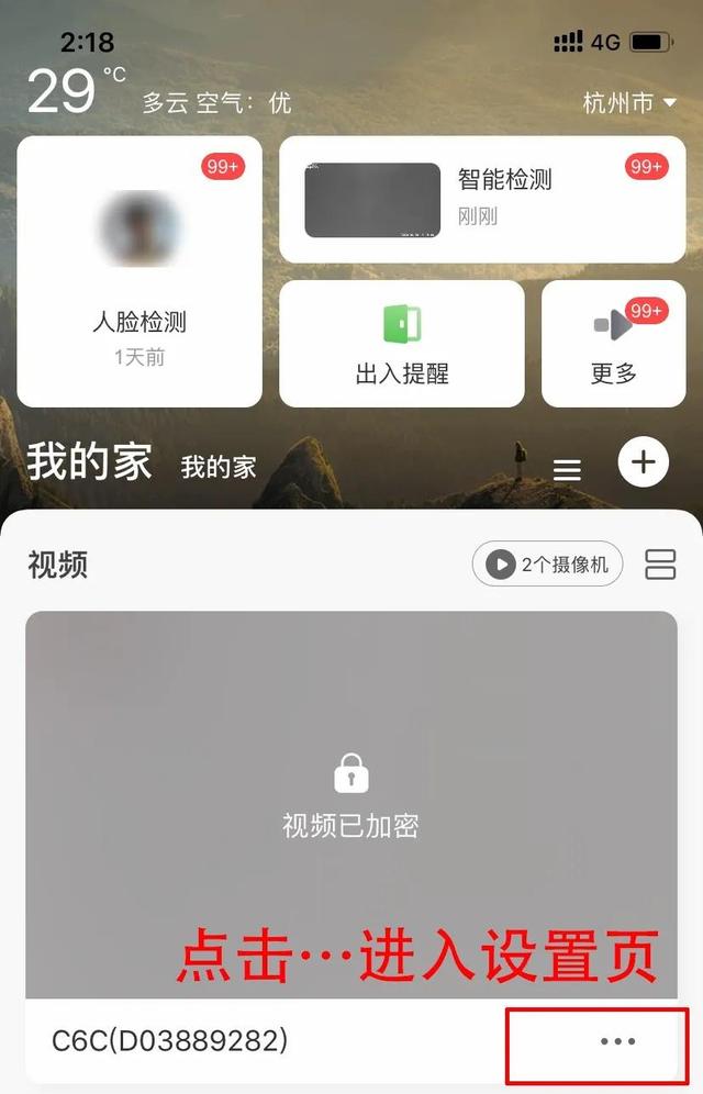登录萤石云视频APP,在首页找到需要翻转的摄像头,点击视频右下角的“…”,点击打开界面的“设置”按钮。